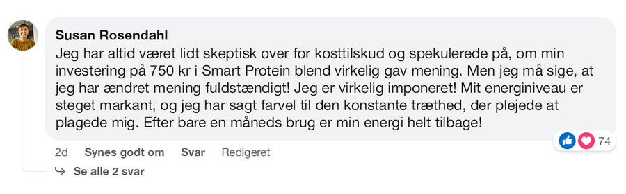 Jeg har haft symptomer som kronisk træthed i årevis. Siden jeg begyndte at bruge Smart Protein Blend (i 3 måneder nu), føler jeg mig mere frisk. Jeg mærker endda en stor forskel, hvis jeg glemmer det en dag. Så jeg vil helt sikkert fortsætte!